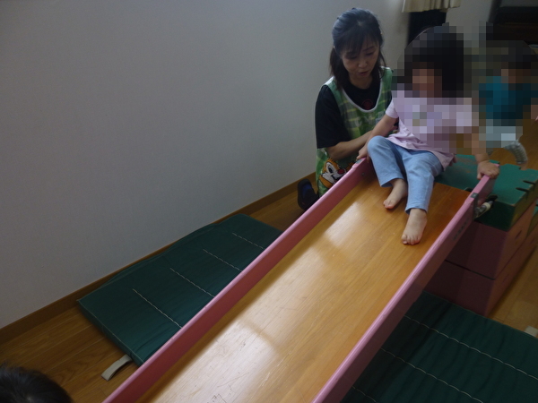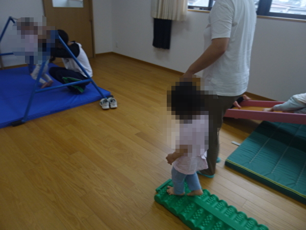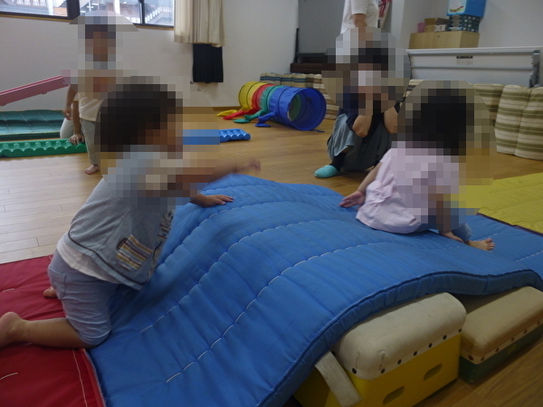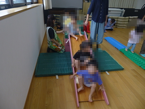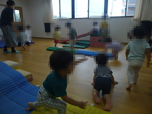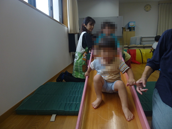今回は3組が参加していただき、1歳児クラスの園児と一緒に、すべり台や鉄棒、マットやトンネルを使って自由に遊んでいただきました。