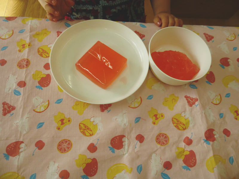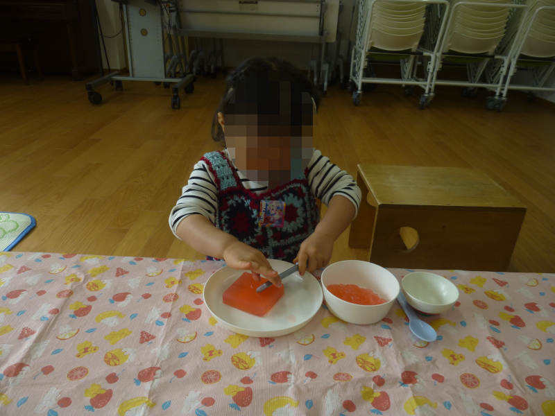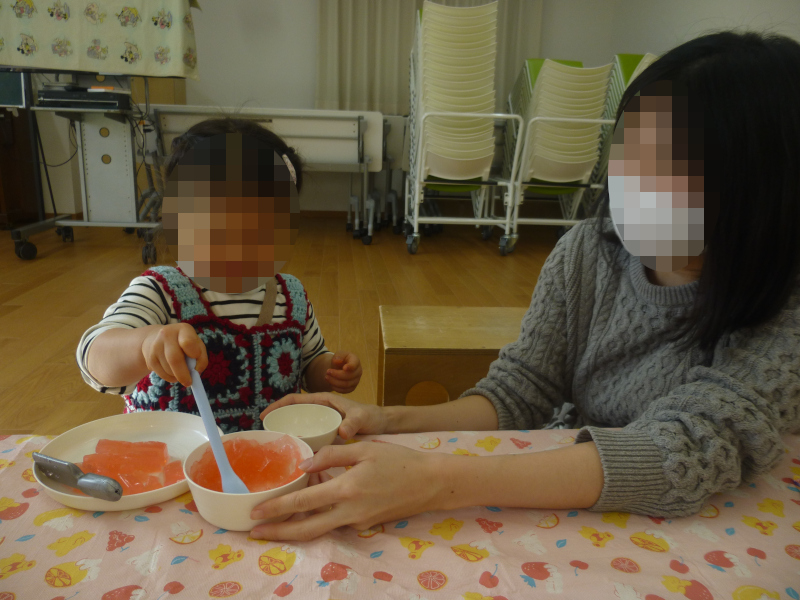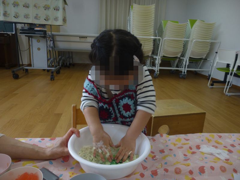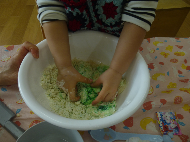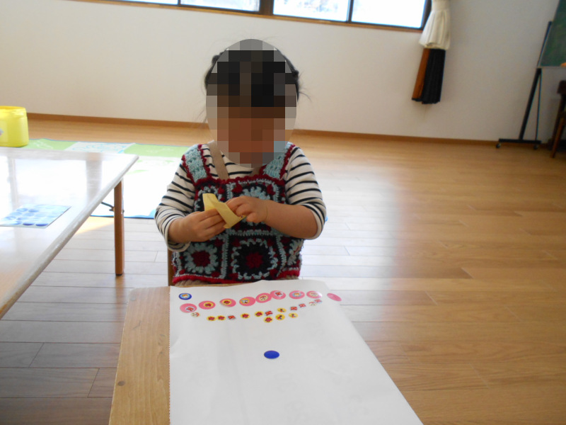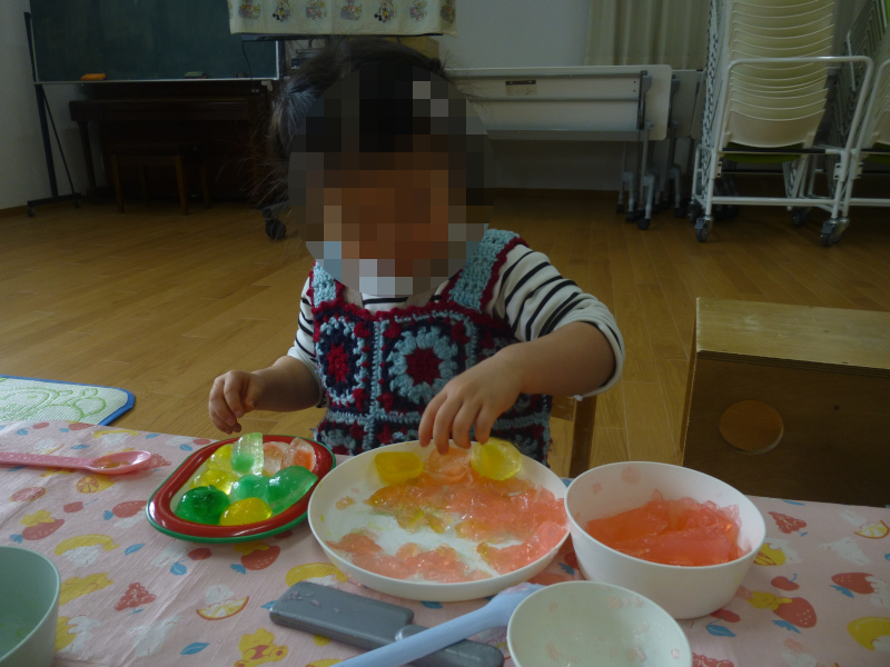 感触あそびの紹介の中から、今日は小麦粉粘土の作り方を一から一緒に作りました。 出来上がった小麦粉粘土や事前に作っていた寒天・氷などを触れて遊んでいただき、その後シール貼りなど指先を使ってたくさん遊んでいただきました。