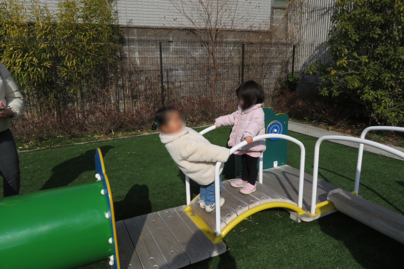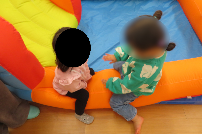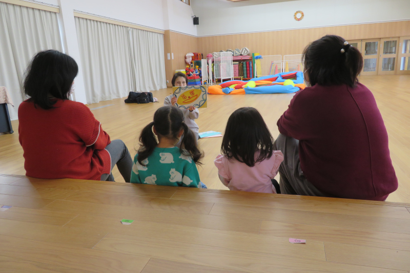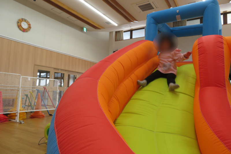 今回は2組参加してくださいました。少し風が冷たかったですが、園庭の乳児用遊具で体を動かし楽しんでいただいた後、ホールに移動してエア遊具でも遊んでいただきました。紙芝居も見ていただき楽しく過ごしてくださいました。