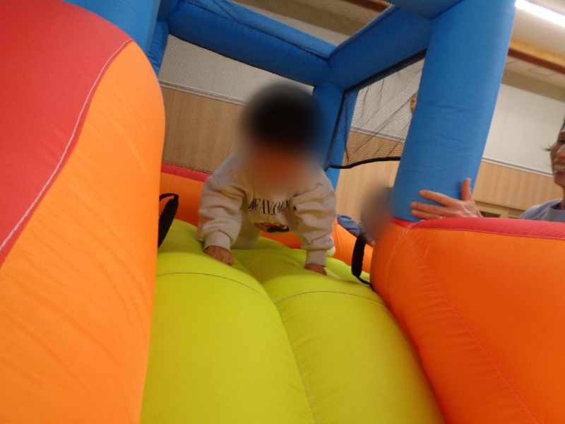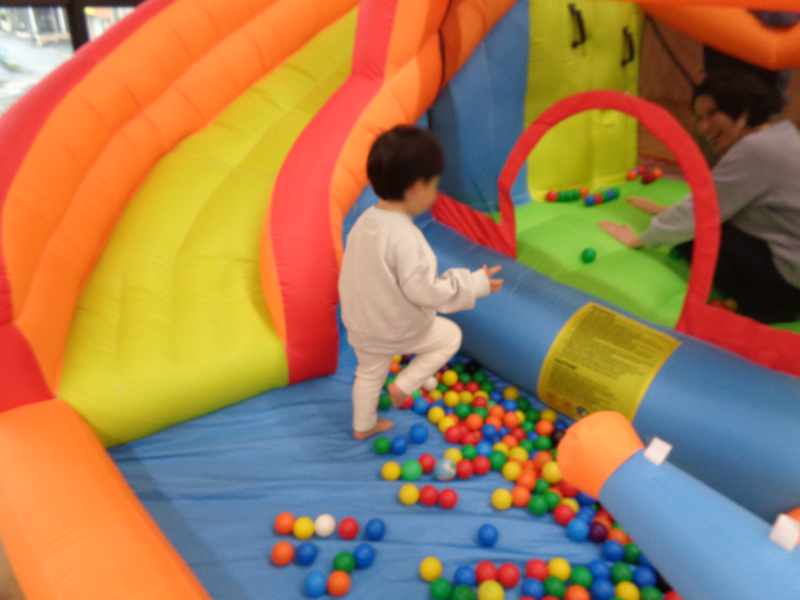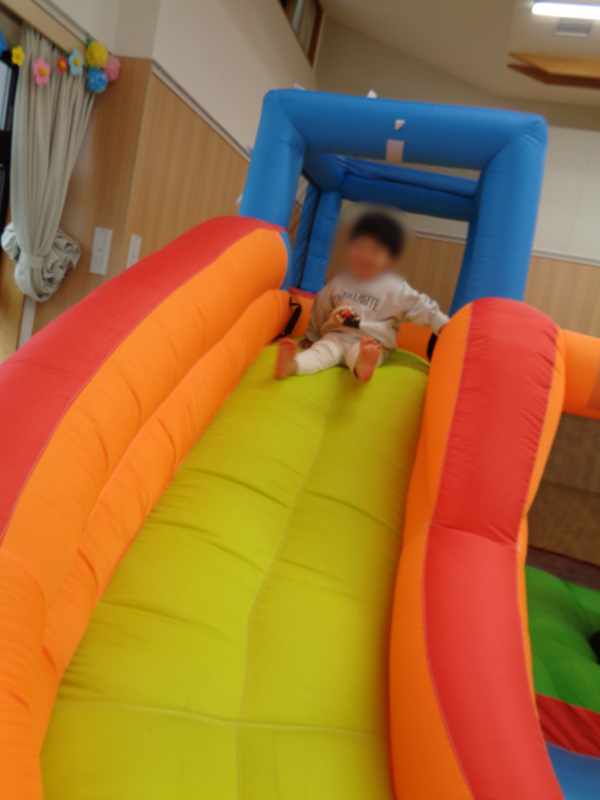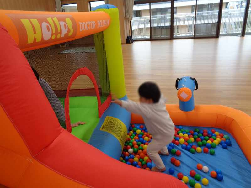 エア遊具のボールを投げたり、すべり台を滑ったり、手押し車に乗ったりと、体をたくさん動かして楽しみました。
