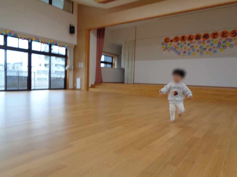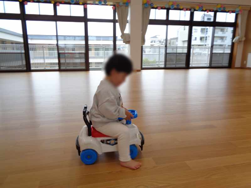 雨天だった為、ホールにてエア遊具や手押し車で遊びました。