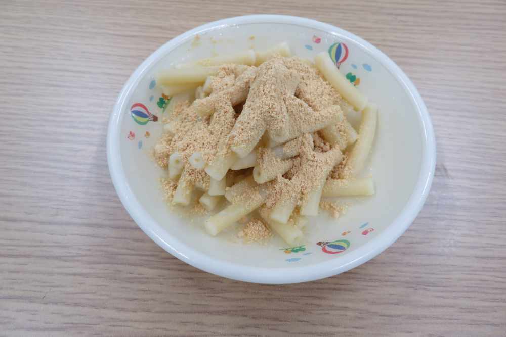 その後、おやつのマカロニにきな粉をまぶした「黄金マカロニ」を試食していただきました。
