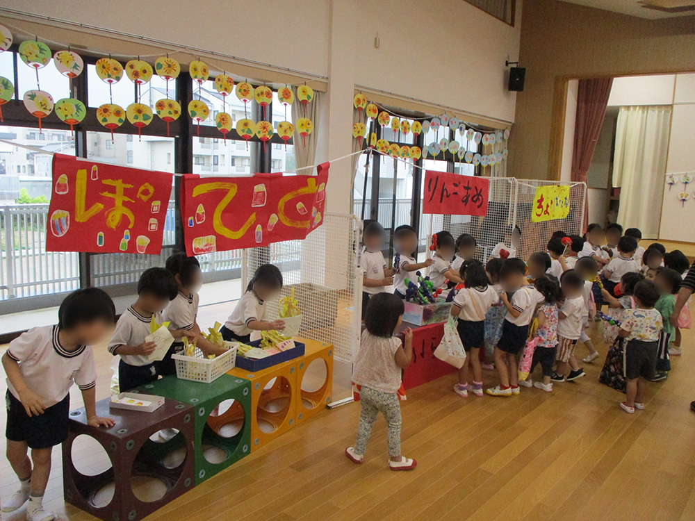 子どもたちの夏のお楽しみです。関西地方では、「地蔵盆」として親しまれている行事ですが、園ではみんなでお地蔵様の法要を行い、その後夜店ごっこや盆踊りを楽しみます。