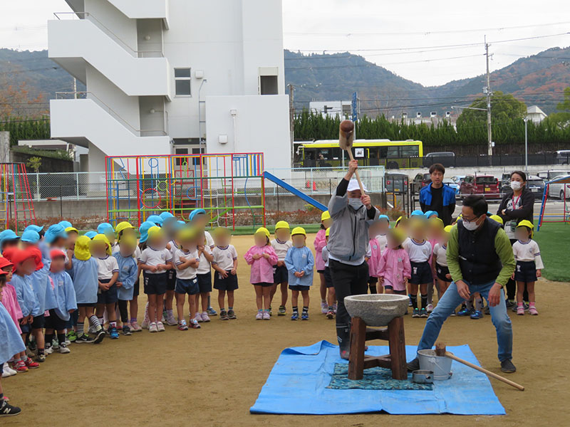 杵と臼でついたお餅ができあがっていく様子を見ています。ヨイショ、ヨイショと迫力のあるかけ声とともに、お餅がつき上がっていきます。子どもたちは、揚げ餅にしておやつにいただきます。